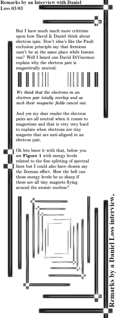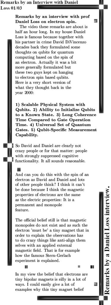 This is the guy that back in the year 2000 together with David DiVincenzo formulated some criteria for qubits for quantum computing. These criteria are, as far as I know, not specific to qubits based on electron spin, but all electron spin qubit people know these criteria. Daniel is strongly interested in qubits based on electron spin, for David I do not know. What I find interesting is that how can you work for half a century on electron spin and never realize there is something wrong with the official version of bipolar magnetism that has to serve as the spin of the electron or as I often say it: It’s magnetic properties. All this garbage like anti-aligned spins in electron pairs or, also very crazy, in chemistry a non-bonding pair like in molecular oxygen has it’s electron spins aligned. All these garbage ‘results’ are only there if you view electrons as tiny bipolar magnets. If on the other hand you simply say: The magnetic properties on an electron are the same as the electric properties in the sense that is it permanent and monopole.
